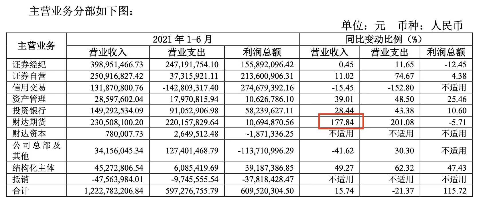 各主业务务来看,证券经纪营业是财达证券业务收入的紧急支柱,但呈报期内增速相对较慢,同比增幅仅为0.45%。相较于经纪营业的呈现,期货营业增速万分明显。数据显示,2021年上半年,财达期货累计实行业务收入2.31亿元,同比大增177.84%。