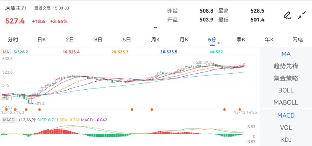 金投网APP行情中央数据显示,截止2022年12月13日下昼15:00收盘,原油期货主力合约行情音讯:最新价:527.4,涨跌:18.6,涨跌幅:3.66%,成交量:201067手,开盘价:503.9,昨收价:507.2,最高价:528.5,最低价:501.4。