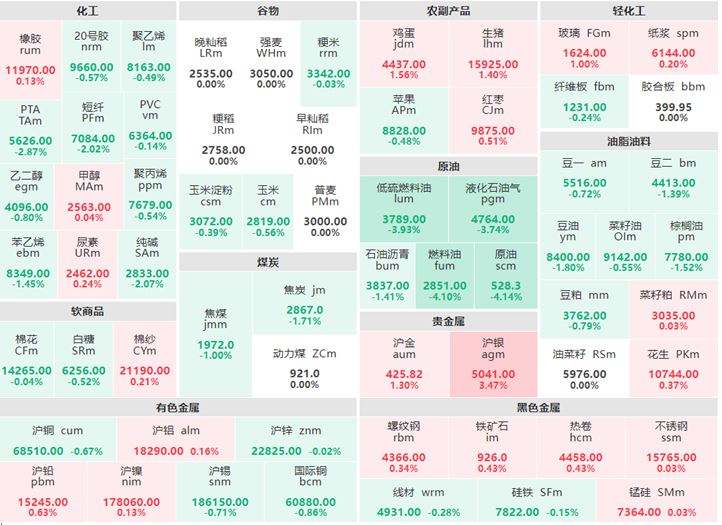 涨幅方面,沪银主力上涨3.47%,报5041.00元/千克;沪金主力上涨1.3%,报425.82元/克;鸡蛋主力上涨1.56%,报4437.00元/吨;生猪主力上涨1.4%,报15925.00元/吨;玻璃主力上涨1%,报1624.00元/吨。