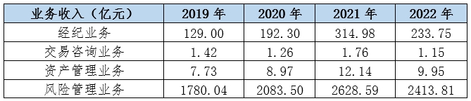 截至2022岁晚,中邦期货公司总资产约1.7万亿元,净资产1841.65亿元,同比不同增加23.06%和14.07%。本钱气力连接巩固[7]。经纪生意收入233.75亿元,同比降低25.79%;交往筹商生意收入1.15亿元,同比降低34.66%;资产束缚生意收入9.95亿元,同比降低18.04%;危害束缚生意收入2413.81亿元,同比降低8.17%[8]。(外6)