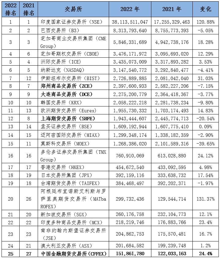 依照Futures Industry Association(FIA)统计的环球成交量数据,2022年,郑商所、大商所、上期所和中金所正在环球交往所期货和期权成交量排名平分别位居第8、第9、第12和第25.中金所较2021年擢升2位,大商所排名没有蜕化,郑商所、上期所较2021年不同降低1位和4位。(外1)