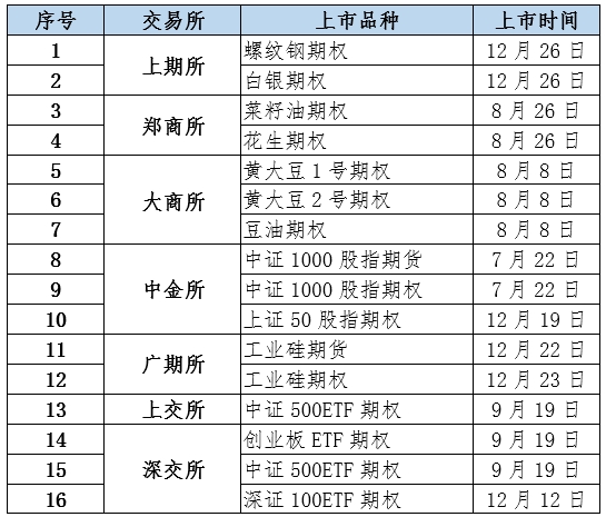 2022年终年一共上市了16个期货期权新种类(外5),搜罗2个期货种类、14个期权种类。个中,上期所上市了螺纹钢期权和白银期权;郑商所上市了菜籽油期权和花生期权;大商所上市了黄大豆1号期权、黄大豆2号期权和豆油期权;中金所上市了中证1000股指期货、中证1000股指期权和上证50股指期权;广期所上市了工业硅期货和工业硅期权;上交所上市了中证500ETF期权;深交所上市了创业板ETF期权、中证500ETF期权和深证100ETF期权。