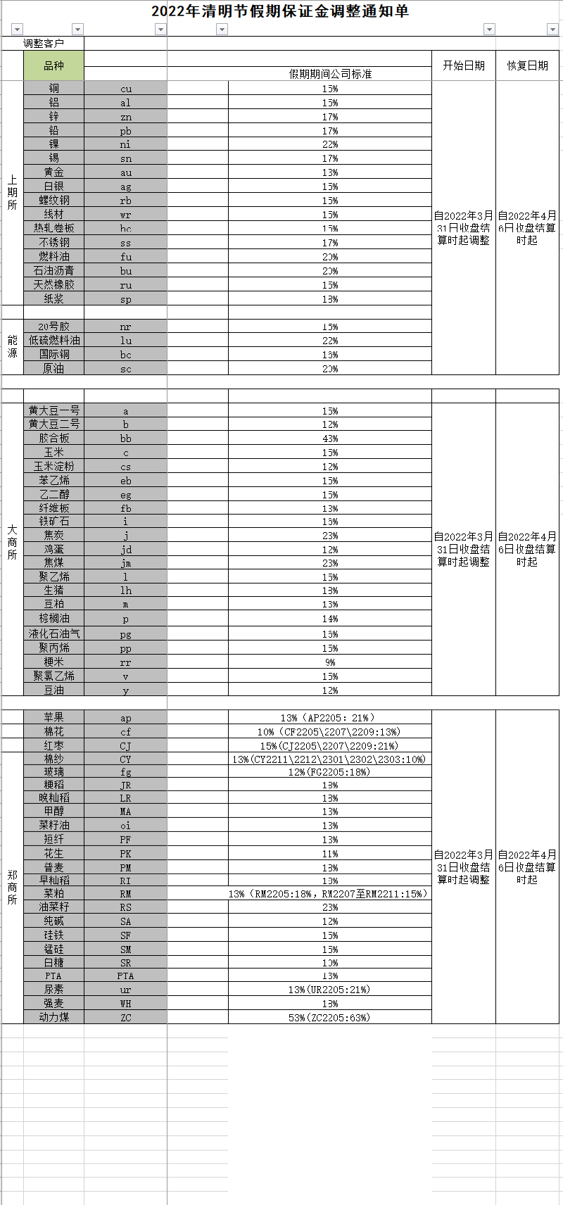 2022年清明节邻近,五家期货往还所裁夺2022年4月2日至2022年4月5日为节假日歇市。