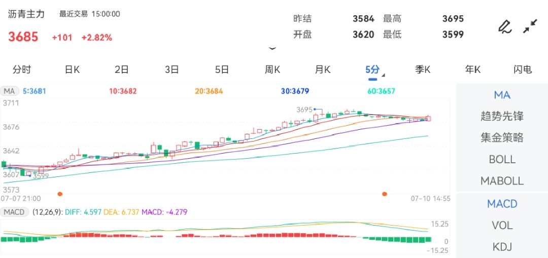 7月10日盘中,邦内期货主力合约涨跌纷歧。此中,沥青期货主力合约开盘报3620元/吨,今日盘中低位惊动运转,早盘收涨2.87%;截至发稿,沥青主力最高触及3695元,下方探低3599元,涨幅达2.71%邻近。